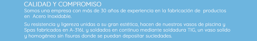 Su resistencia y ligereza unidas a su gran estética, hacen de nuestros vasos de Piscina, Mini Piscina y Spa fabricados en A-316L y soldados en continuo mediante soldadura TIG, un vaso solido y homogéneo sin fisuras donde se puede depositar la suciedad.