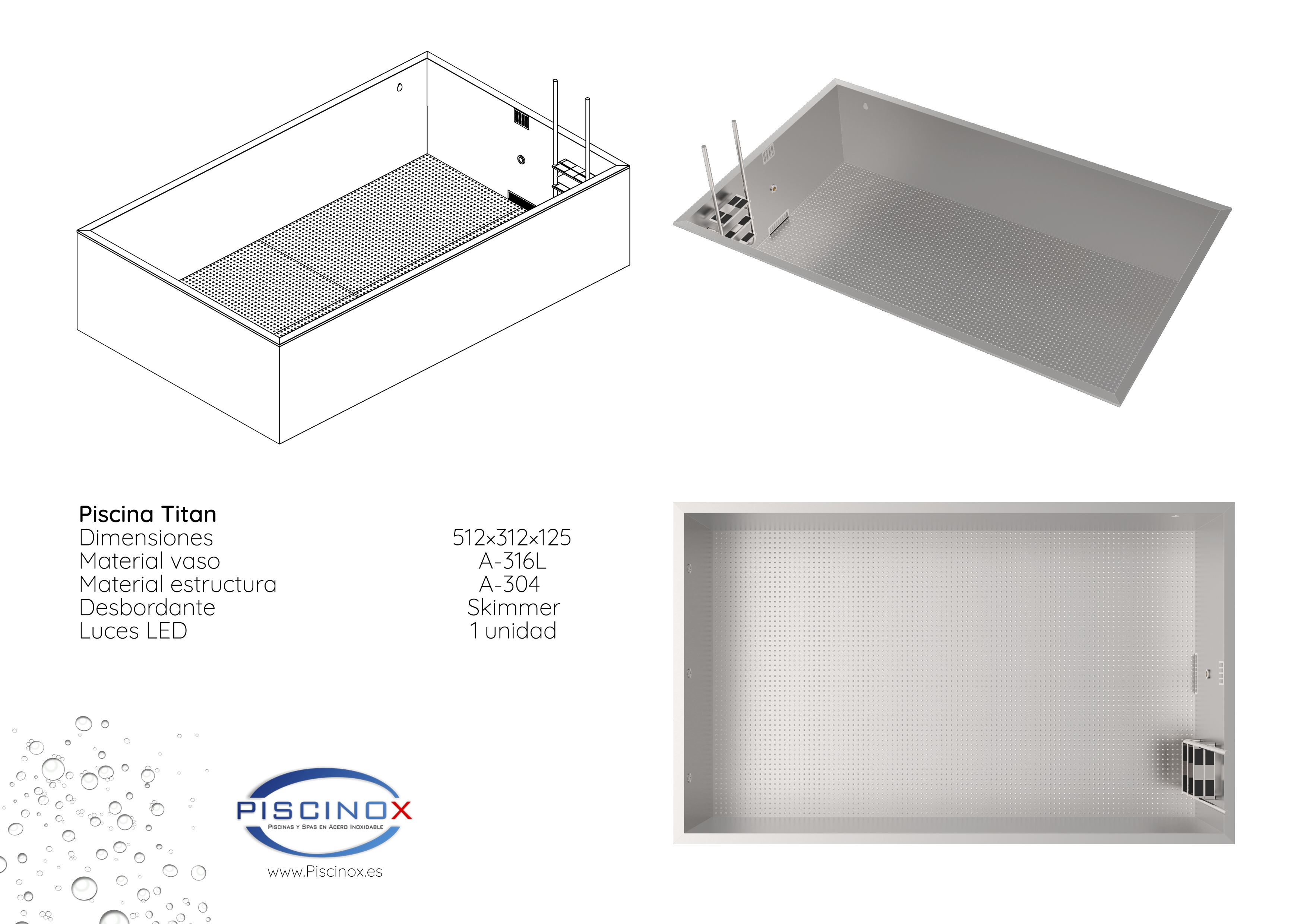 Piscinox piscinas prefabricadas en Acero Inoxidable A-316L, transportable y muy ligera, sin las molestias de la obra y mas segura que una piscina de obra, el Acero Inoxidable es un material flexible y es capaz de aguantar deformaciones sin ningún tipo de fisura. Ideal para Áticos y Terrazas.