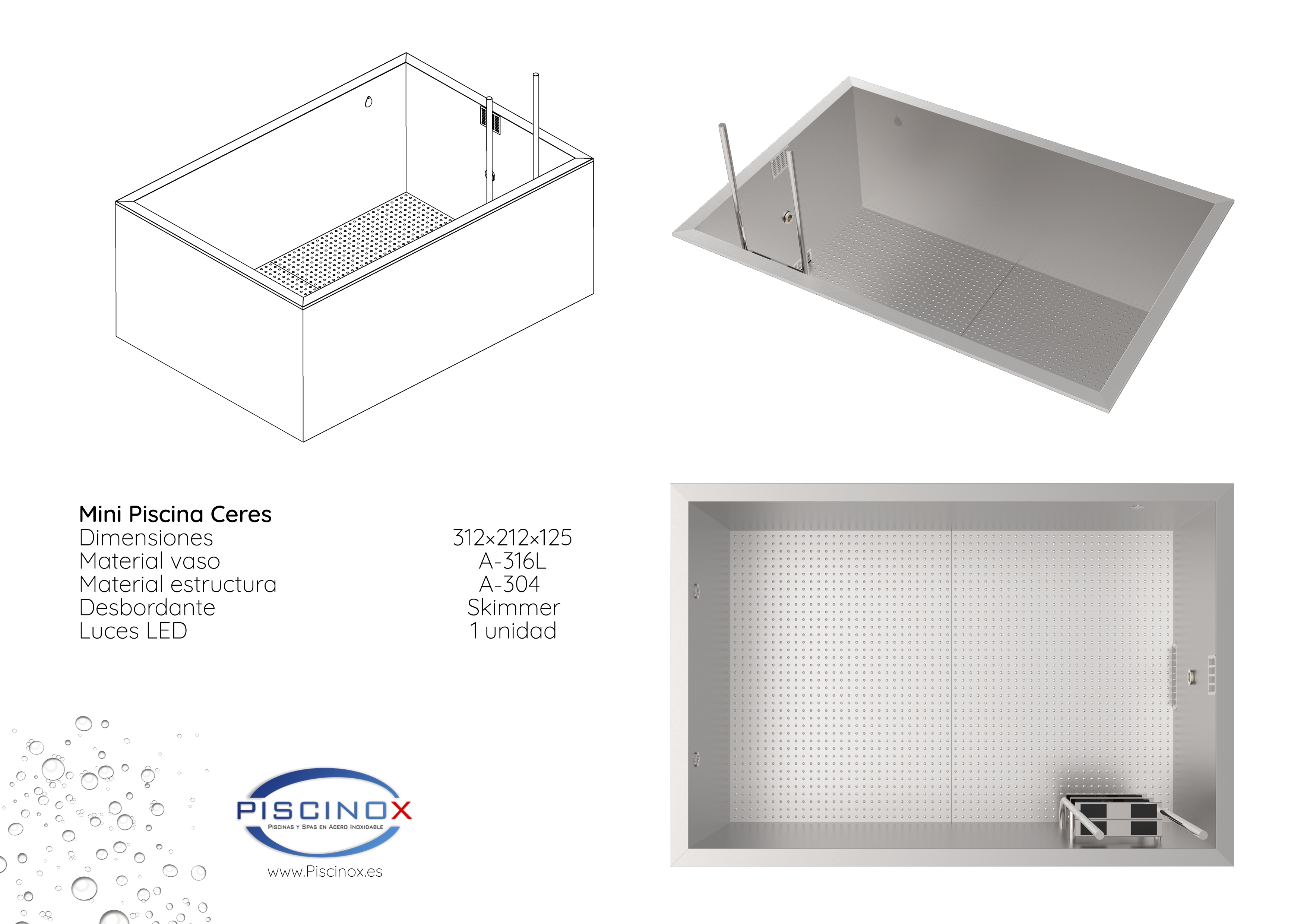 Mini piscina modular en Acero Inoxidable A-316,transportable y sin obras. Muy ligera ideal para su Ático o Terraza, idea de fabricación estándar, opción de fabricar a medida adaptándose a las demandas del cliente. El Acero Inoxidable es ideal para piscinas por su flexibilidad evitando roturas y fugas, así como su alta capacidad higiénica.